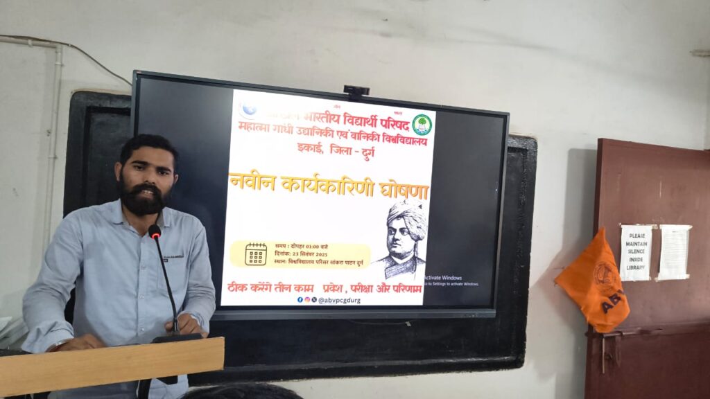 दुर्ग, 23 सितम्बर। अखिल भारतीय विद्यार्थी परिषद (अभाविप) की महात्मा गांधी उद्यानिकी एवं वानिकी विश्वविद्यालय इकाई, जिला दुर्ग की नई कार्यकारिणी की घोषणा मंगलवार को विश्वविद्यालय परिसर सांकरा पाटन में की गई। इस अवसर पर बड़ी संख्या में विद्यार्थी एवं कार्यकर्ता उपस्थित रहे।