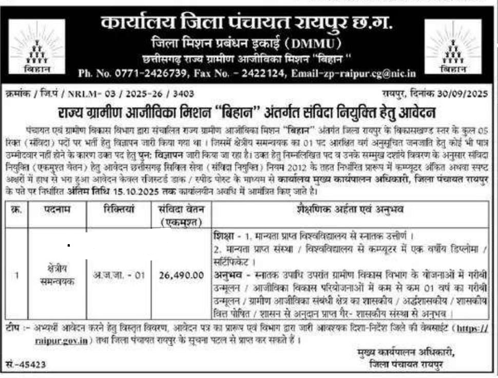 जिला पंचायत रायपुर, छत्तीसगढ़ राज्य ग्रामीण आजीविका मिशन “बिहान” अंतर्गत संविदा नियुक्ति हेतु आवेदन आमंत्रित किए गए हैं। यह नियुक्ति ब्लॉक स्तर पर की जाएगी। विज्ञापन के अनुसार क्षेत्रीय समन्वयक (Regional Coordinator) के पद पर एक पद (अनुसूचित जाति वर्ग हेतु) रिक्त है। इस पद हेतु संविदा वेतन ₹26,490/- प्रतिमाह निर्धारित किया गया है।