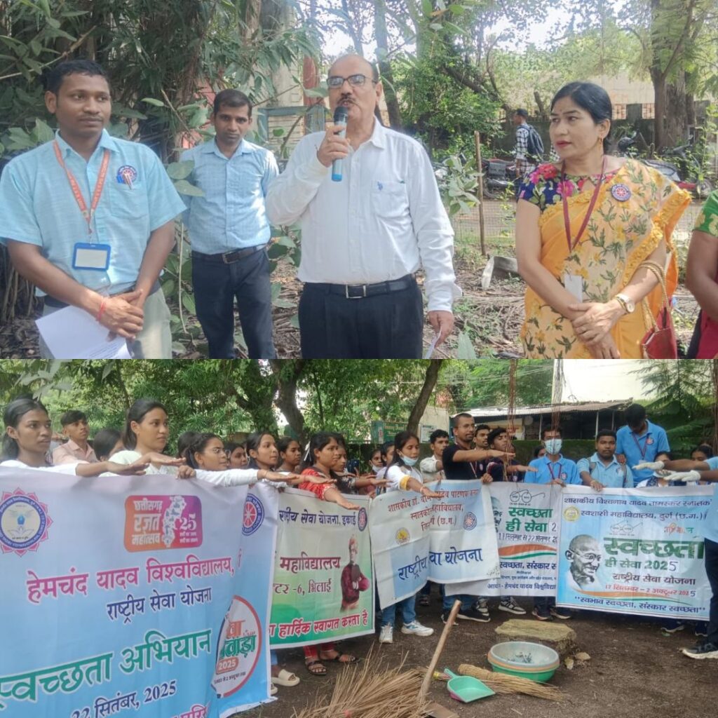 दुर्ग। उच्च शिक्षा विभाग के निर्देशानुसार 17 सितंबर से 02 अक्टूबर तक समस्त विश्वविद्यालयों एवं महाविद्यालयों में चल रहे सेवा पखवाड़ा कार्यक्रम के अंतर्गत हेमचंद यादव विश्वविद्यालय, दुर्ग की राष्ट्रीय सेवा योजना (एनएसएस) प्रकोष्ठ द्वारा सोमवार को स्वच्छता अभियान, चित्रकला प्रतियोगिता एवं नुक्कड़ नाटक का सफल आयोजन किया गया।