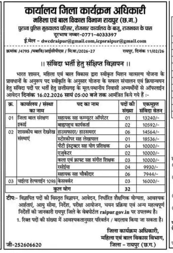 कार्यालय जिला कार्यक्रम अधिकारी, महिला एवं बाल विकास विभाग, रायपुर (छत्तीसगढ़) द्वारा भारत शासन की स्वीकृत मिशन वात्सल्य योजना के अंतर्गत विभिन्न संविदा पदों पर भर्ती हेतु संक्षिप्त विज्ञापन जारी किया गया है। योजना के सफल संचालन एवं क्रियान्वयन के लिए छत्तीसगढ़ के मूल/स्थानीय निवासी अभ्यर्थियों से ऑफलाइन आवेदन आमंत्रित किए गए हैं। आवेदन जमा करने की अंतिम तिथि 16 फरवरी 2026 सायं 05:00 बजे तक निर्धारित की गई है।