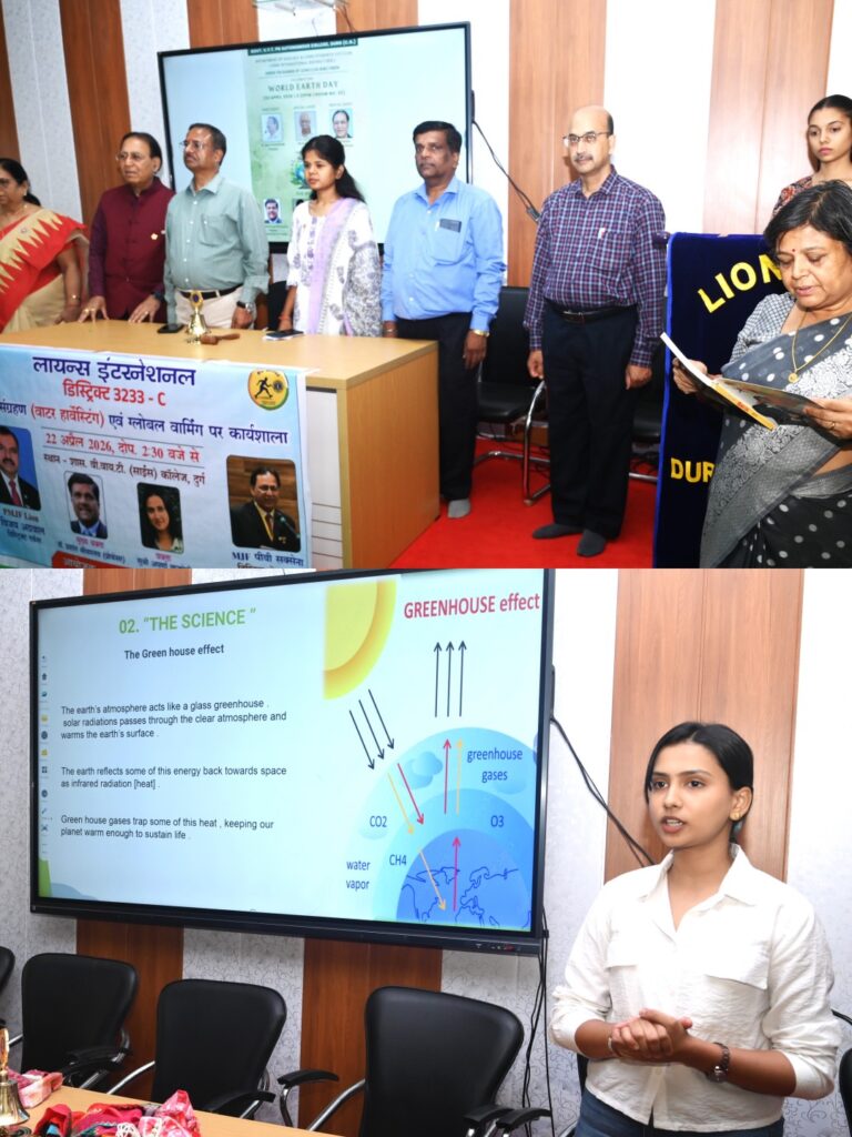 рд▓рд╛рдпрдВрд╕ рдХреНрд▓рдм рджреБрд░реНрдЧ рд╡рд┐рдЬрди рдХреЗ рдбрд┐рд╕реНрдЯреНрд░рд┐рдХреНрдЯ рдЪреЗрдпрд░ рдкрд░реНрд╕рди рдкреА.рдмреА. рд╕рдХреНрд╕реЗрдирд╛ рдиреЗ рдЕрдкрдиреЗ рд╕рдВрдмреЛрдзрди рдореЗрдВ рдЧреНрд▓реЛрдмрд▓ рд╡рд╛рд░реНрдорд┐рдВрдЧ рдФрд░ рдЬрд▓рд╡рд╛рдпреБ рдкрд░рд┐рд╡рд░реНрддрди рдХреЛ рд╡рд░реНрддрдорд╛рди рд╕рдордп рдХреА рдЧрдВрднреАрд░ рд╕рдорд╕реНрдпрд╛ рдмрддрд╛рддреЗ рд╣реБрдП рджреБрд░реНрдЧ-рднрд┐рд▓рд╛рдИ рдХреНрд╖реЗрддреНрд░ рдореЗрдВ рдмрдврд╝рддреЗ рддрд╛рдкрдорд╛рди рдкрд░ рдЪрд┐рдВрддрд╛ рдЬрддрд╛рдИред