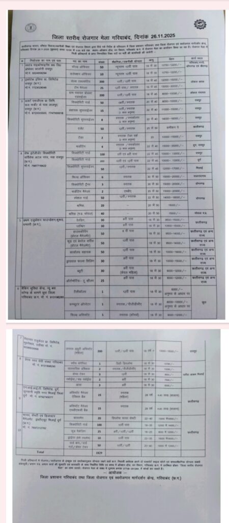 गरियाबंद। जिला प्रशासन गरियाबंद एवं जिला रोजगार तथा स्वरोजगार मार्गदर्शन केंद्र के संयुक्त तत्वावधान में दिनांक 26 नवंबर 2025 को जिला स्तरीय रोजगार मेला आयोजित किया जा रहा है। इस मेले में विभिन्न प्रतिष्ठित कंपनियों द्वारा कुल 1829 पदों पर भर्ती की जाएगी।