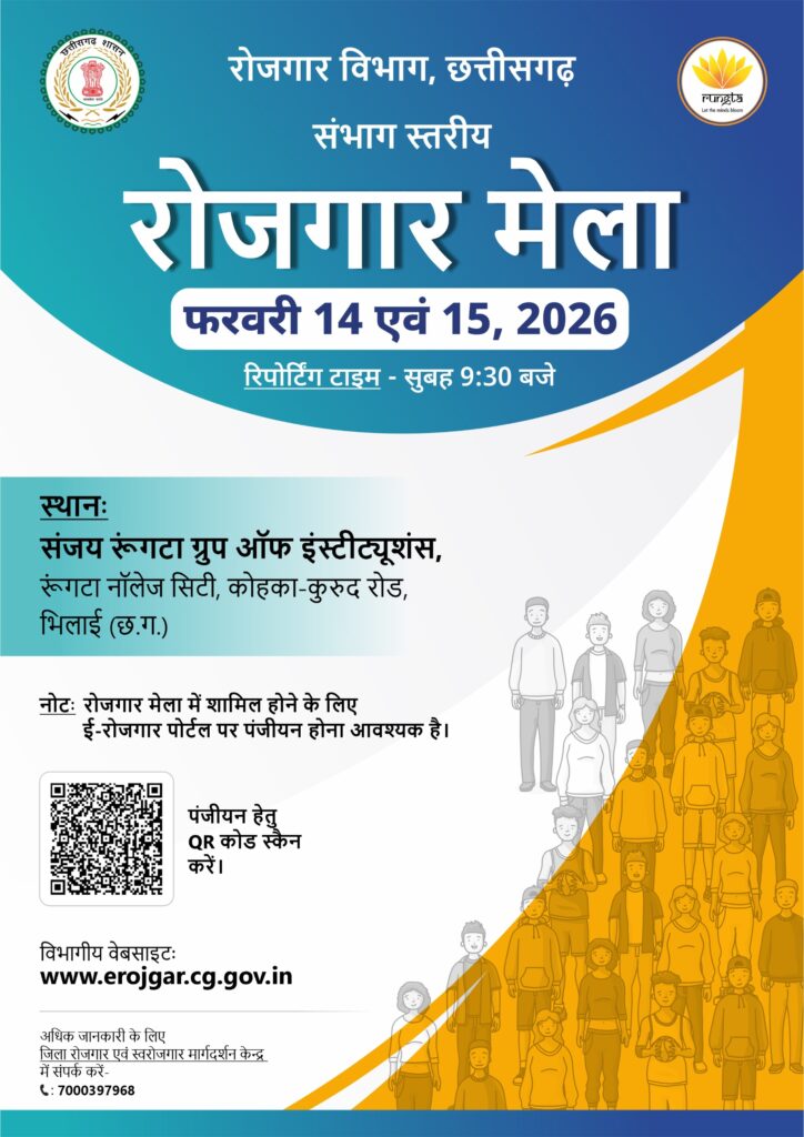 भिलाई। रोजगार विभाग, छत्तीसगढ़ द्वारा युवाओं को रोजगार के बेहतर अवसर उपलब्ध कराने के उद्देश्य से संभाग स्तरीय रोजगार मेले का आयोजन 14 एवं 15 फरवरी 2026 को किया जा रहा है। मेले में शामिल होने के लिए अभ्यर्थियों को सुबह 9:30 बजे रिपोर्टिंग करनी होगी।