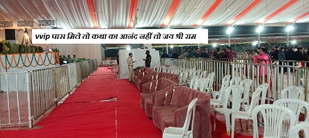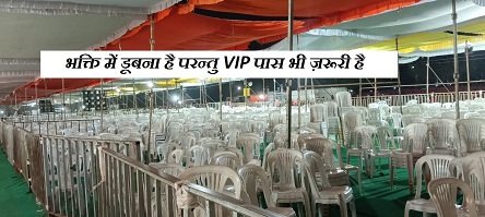 तीसरा चित्र वीवीआईपी कैटेगरी का है—लाल कालीन, आरामदायक सोफे और अलग व्यवस्था। यह वे लोग हैं जो अपनी सामाजिक, राजनीतिक या प्रशासनिक पहुंच के सहारे समय पर आएंगे, कथा सुनेंगे और सम्मान के साथ लौट जाएंगे।