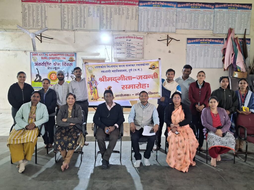 दुर्ग। शासकीय विज्ञान महाविद्यालय, दुर्ग में संस्कृत एवं योग विभाग के संयुक्त तत्वावधान में गीता जयंती समारोह श्रद्धा, भक्ति और उत्साह के वातावरण में आयोजित किया गया। महाविद्यालय के प्राचार्य डॉ. अजय कुमार सिंह के मार्गदर्शन में हुए इस समारोह में सामूहिक गीता श्लोक पाठ किया गया, जिसमें महाविद्यालय के प्राध्यापक एवं विद्यार्थियों ने उत्साहपूर्वक सहभागिता की।