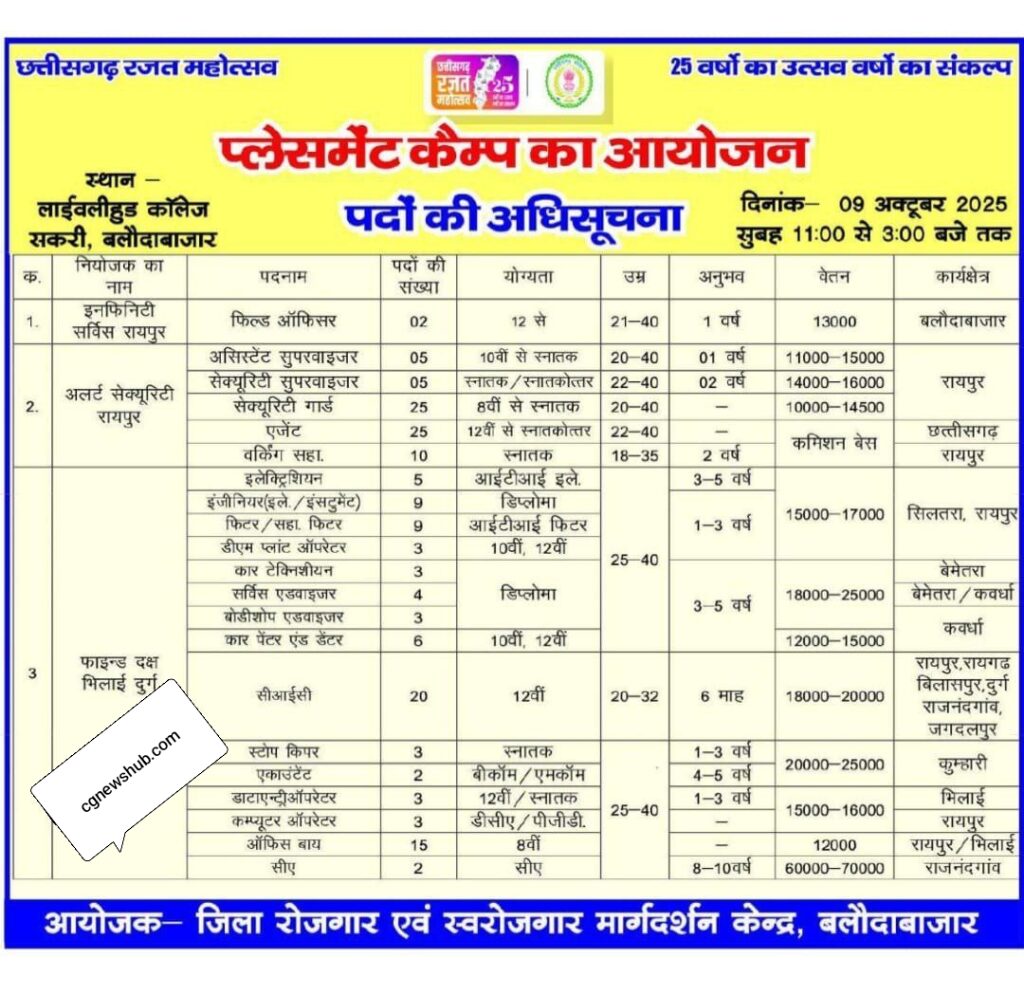 जिला रोजगार एवं स्वरोजगार मार्गदर्शन केंद्र, बलौदाबाजार द्वारा 9 अक्टूबर 2025 को लाइवलीहुड कॉलेज, सकरी (बलौदाबाजार) में एक प्लेसमेंट कैंप का आयोजन किया जा रहा है। यह कैंप सुबह 11:00 बजे से दोपहर 3:00 बजे तक चलेगा। इस रोजगार मेले में विभिन्न नामी कंपनियाँ भाग लेकर युवाओं को रोजगार के अवसर प्रदान करेंगी।