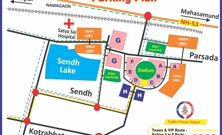 रायपुर। शहीद वीर नारायण सिंह अंतरराष्ट्रीय क्रिकेट स्टेडियम, नया रायपुर में 3 दिसंबर 2025 को होने वाले भारत–दक्षिण अफ्रीका वनडे मैच के लिए यातायात पुलिस रायपुर ने विस्तृत ट्रैफिक और पार्किंग प्लान जारी किया है। राज्य के विभिन्न जिलों से आने वाले दर्शकों और खिलाड़ियों की सुरक्षा व सुगम आवागमन को ध्यान में रखते हुए विशेष मार्ग निर्धारित किए गए हैं।