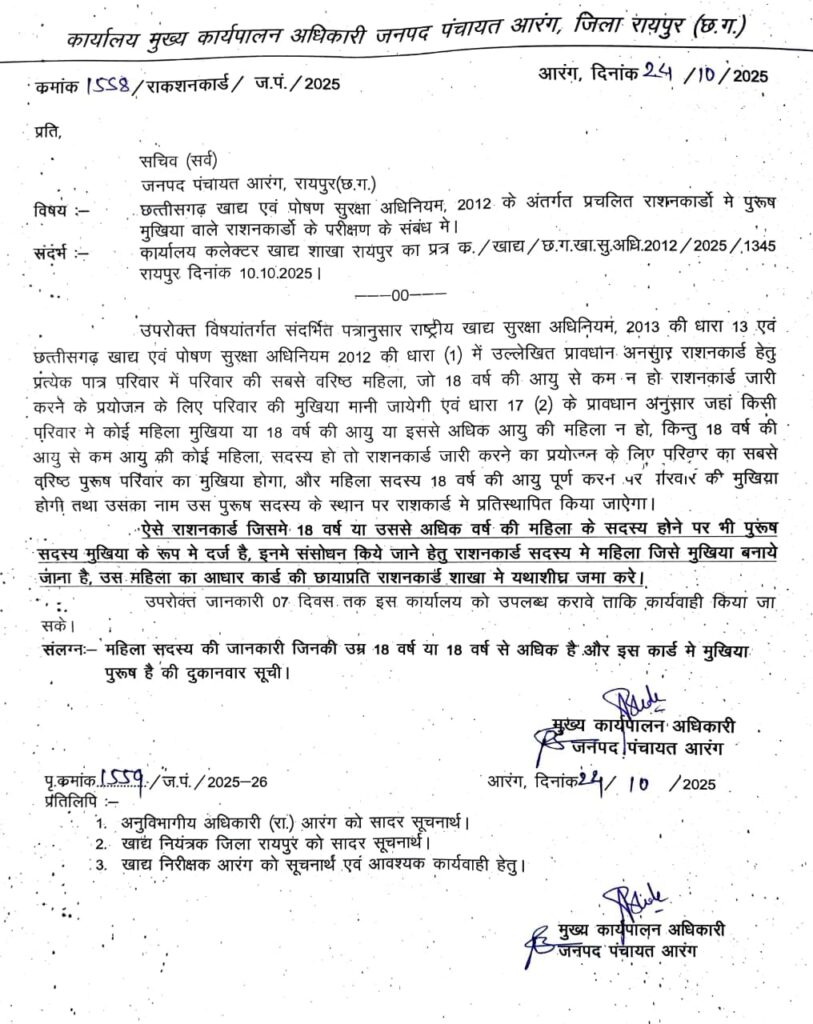 जनपद पंचायत आरंग के मुख्य कार्यपालन अधिकारी ने छत्तीसगढ़ खाद्य एवं पोषण सुरक्षा अधिनियम 2012 के प्रावधानों के तहत संचालित राशनकार्डों में संशोधन संबंधी महत्वपूर्ण निर्देश जारी किए हैं।
