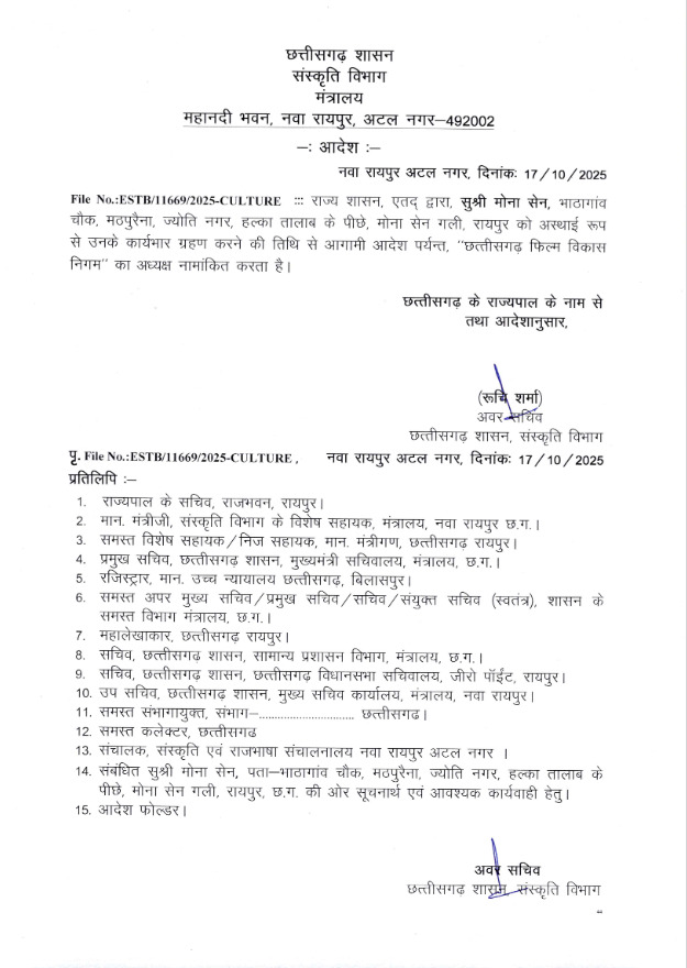 गौरतलब है कि मोना सेन पहले भी फिल्म विकास निगम के बोर्ड में सदस्य रह चुकी हैं और छत्तीसगढ़ी फिल्म इंडस्ट्री के उत्थान में उनका योगदान रहा है। नई जिम्मेदारी मिलने के बाद राज्य के फिल्म जगत से जुड़े कलाकारों और तकनीशियनों ने उन्हें बधाई दी है।