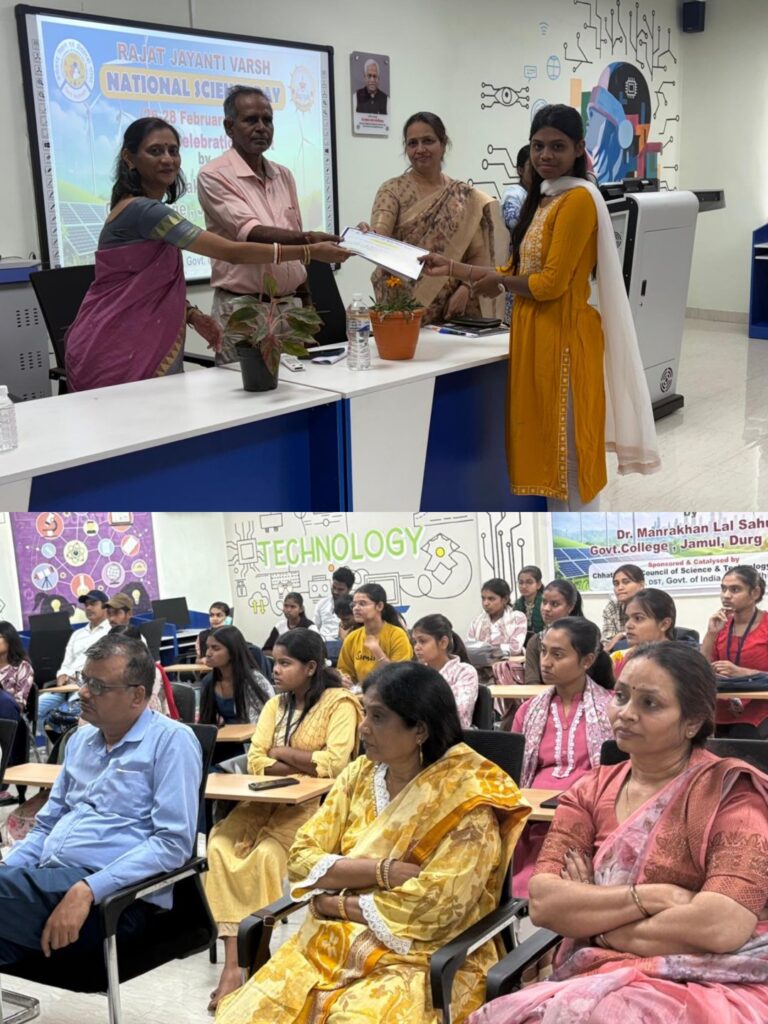 डॉ. मनराखन लाल साहू शासकीय महाविद्यालय, जामुल में 26 से 28 फरवरी 2026 तक राष्ट्रीय विज्ञान दिवस के अवसर पर “विज्ञान में महिलाएं : विकसित भारत की प्रेरक शक्ति” विषय पर त्रिदिवसीय कार्यक्रम का सफल आयोजन किया गया। कार्यक्रम का उद्देश्य विज्ञान के क्षेत्र में महिलाओं की भूमिका को रेखांकित करना तथा वर्ष 2047 तक विकसित भारत के निर्माण में उनके योगदान पर विचार-विमर्श करना रहा।