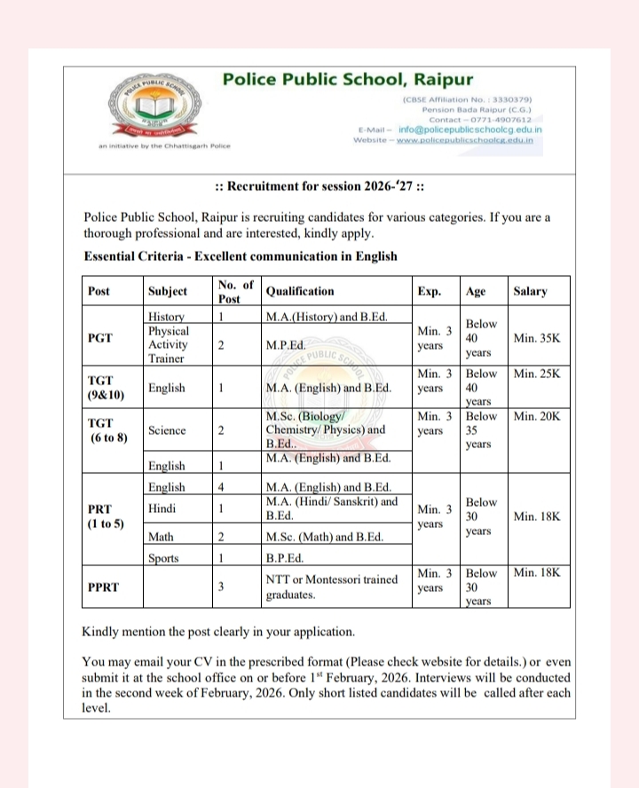 अधिक जानकारी के लिए अभ्यर्थी पुलिस पब्लिक स्कूल, रायपुर की आधिकारिक वेबसाइट या विद्यालय कार्यालय से संपर्क कर सकते हैं।