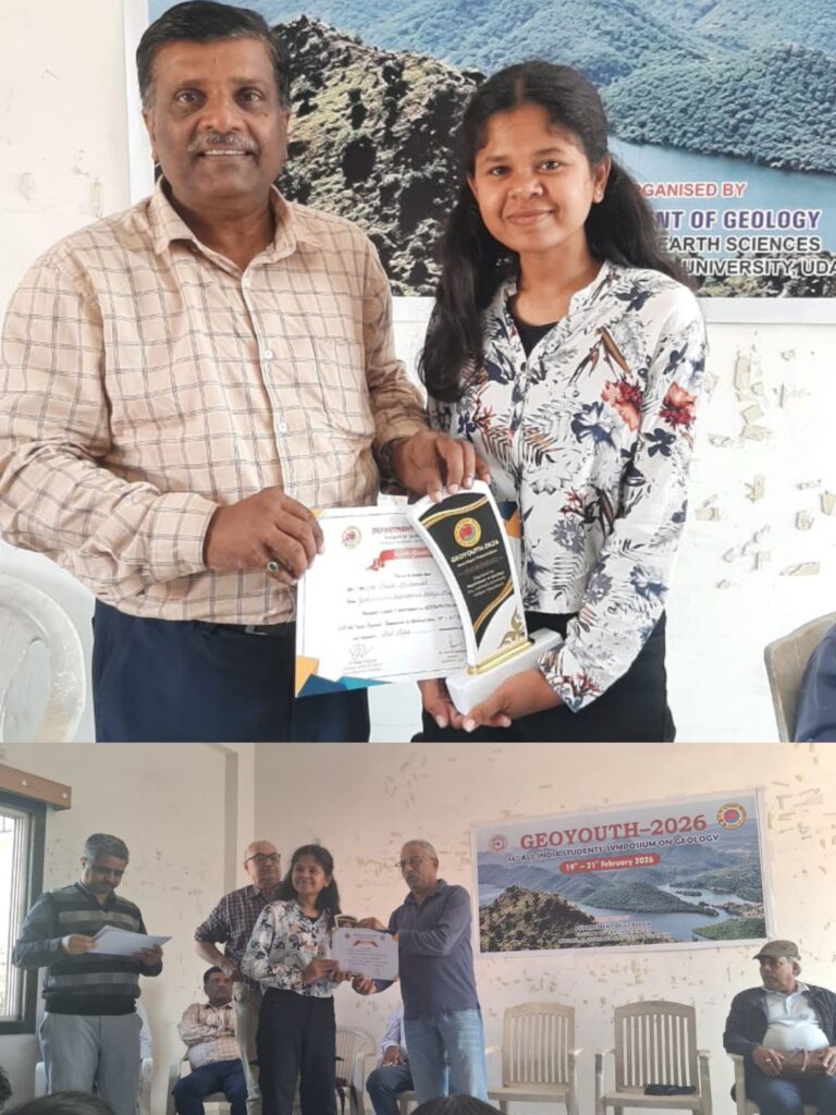 दुर्ग।शासकीय विश्वनाथ यादव तामस्कर स्नातकोत्तर स्वशासी महाविद्यालय, दुर्ग के भूगर्भशास्त्र विषय की एमएससी चतुर्थ सेमेस्टर की छात्रा रूचि देशमुख ने मोहन लाल सुखाड़िया विश्वविद्यालय, उदयपुर, राजस्थान में आयोजित राष्ट्रीय स्तर के जियो यूथ 2026 सेमीनार में श्रेष्ठ शोध पत्र का पुरस्कार प्राप्त किया है। यह जानकारी देते हुए भूगर्भशास्त्र विभाग के विभागाध्यक्ष डॉ. एस.डी. देशमुख ने बताया कि इस जियो यूथ 2026 कॉनक्लेय में 7 राज्यों राजस्थान, छत्तीसगढ़, पंजाब, गुजरात, जम्मू कश्मीर, महाराष्ट्र, मध्यप्रदेश के 15 विश्वविद्यालयों के छात्र छात्राओं ने हिस्सा लिया।