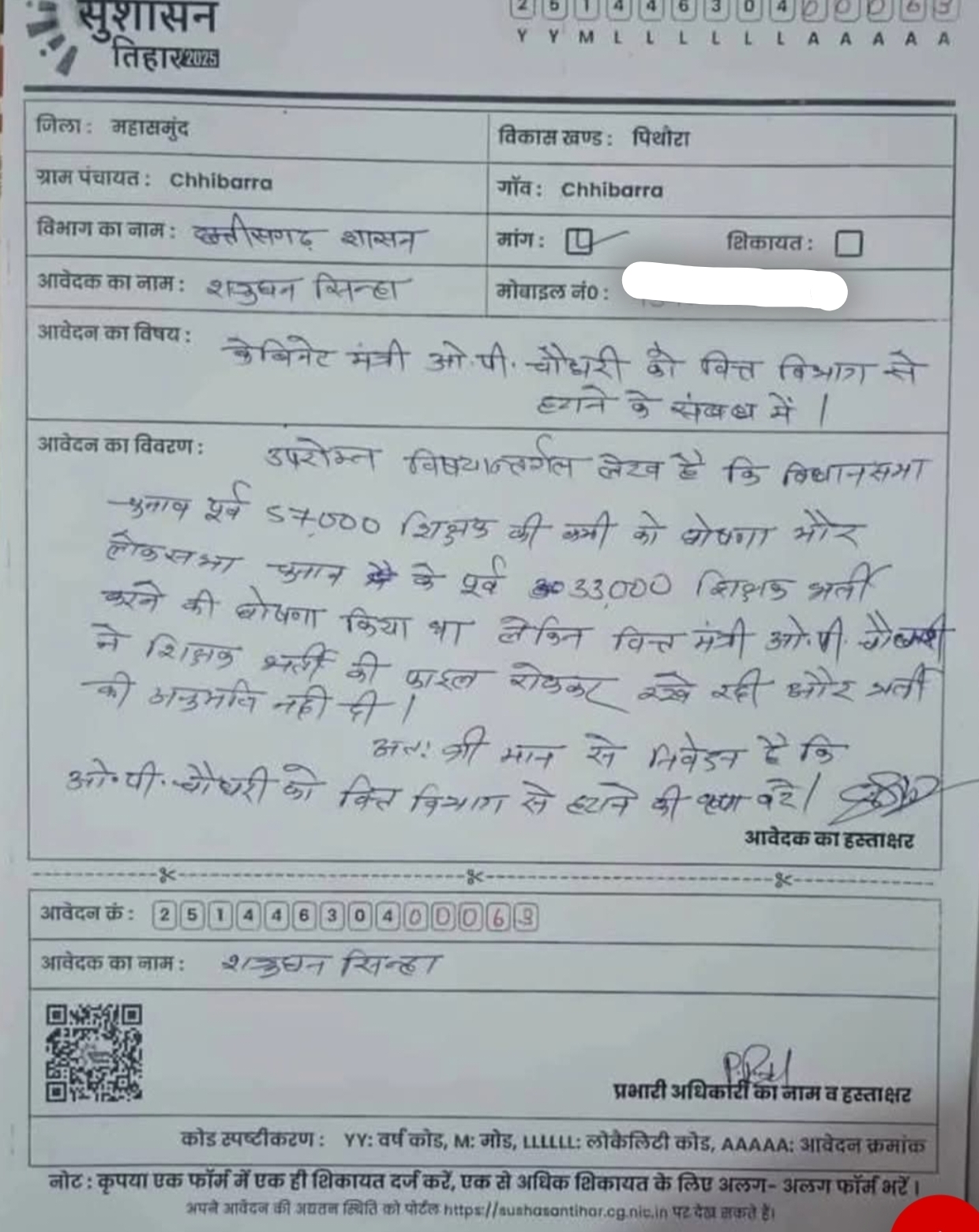 इन सब के बीच एक लेटर सोशल मीडिया में जमकर वायरल हो रहा है। जिसमें शत्रुघ्न सिन्हा नामक आवेदक वित्त मंत्री ओपी चौधरी को हटाने की मांग कर रहे है।