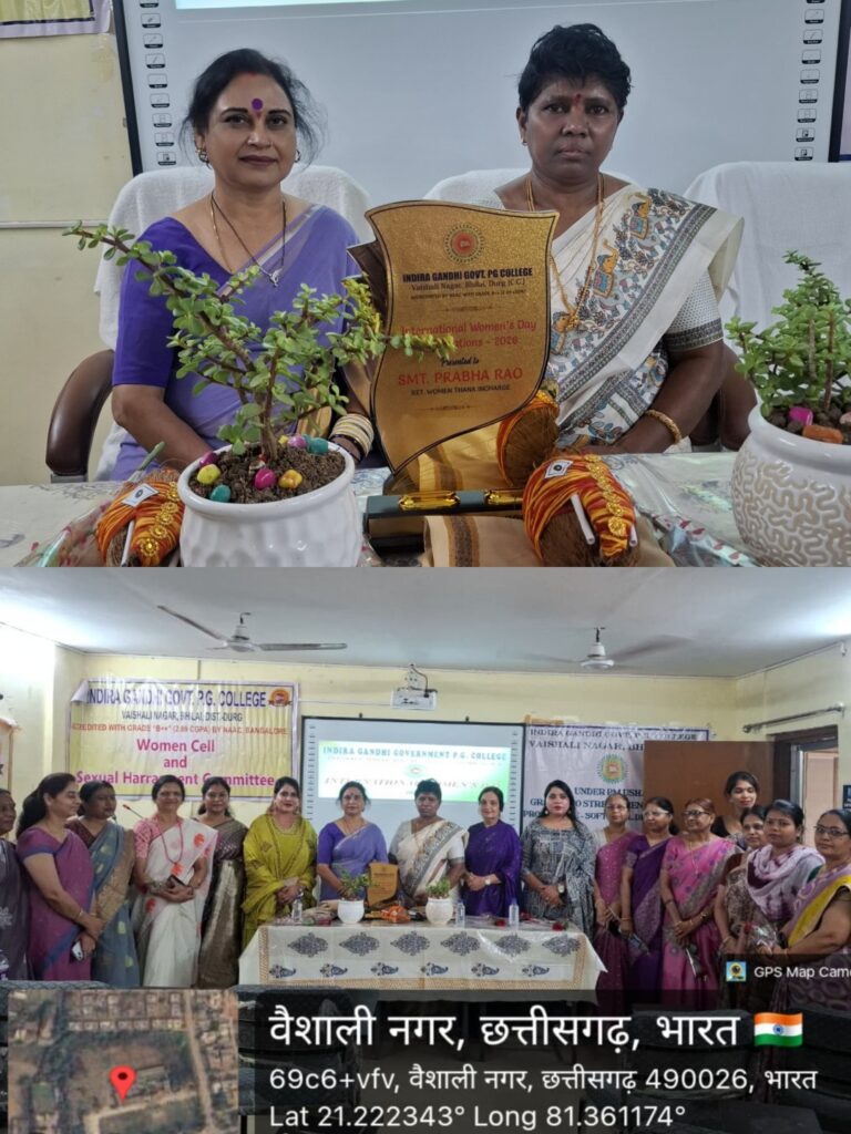 इंदिरा गाँधी शासकीय स्नातकोत्तर महाविद्यालय, वैशाली नगर में अंतर्राष्ट्रीय महिला दिवस के उपलक्ष्य में एक विशेष कार्यक्रम का आयोजन किया गया। कार्यक्रम की अध्यक्षता महाविद्यालय की प्राचार्य डॉ. श्रीमती अल्का मेश्राम ने की, जबकि मुख्य अतिथि के रूप में सेवानिवृत्त महिला थाना प्रभारी श्रीमती प्रभा राव उपस्थित रहीं।