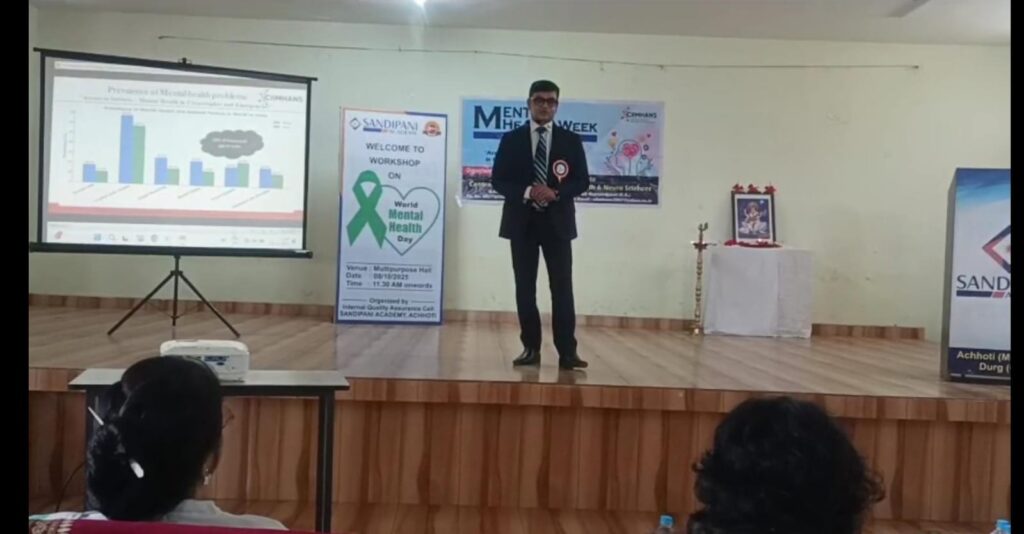 दुर्ग। विश्व मानसिक स्वास्थ्य दिवस के अवसर पर सांदीपनी एकेडमी, अछोटी में आंतरिक गुणवत्ता आश्वासन प्रकोष्ठ (IQAC) एवं राष्ट्रीय सेवा योजना (NSS) इकाई के संयुक्त तत्वावधान में एक सार्थक कार्यशाला का आयोजन किया गया। इस कार्यशाला का मुख्य उद्देश्य विद्यार्थियों, शिक्षकों और आमजन में मानसिक स्वास्थ्य के प्रति जागरूकता बढ़ाना तथा जीवन में मानसिक संतुलन बनाए रखने के उपायों से अवगत कराना था।